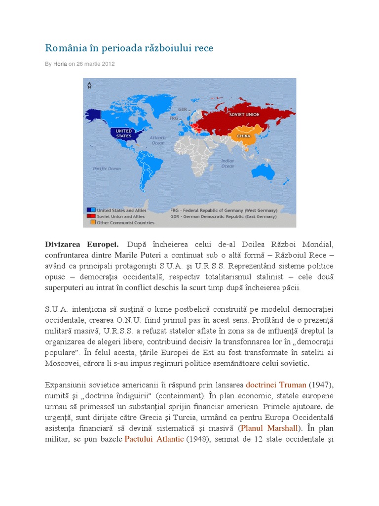 Orase Din Romania Care Au Fost Å£inte Nucleare In RÄzboiul Rece Documente Desecretizate Despre RelaÅ£ia TensionatÄ Dintre Sua Si Uniunea SovieticÄ Source from : https://adevarul.ro/locale/alba-iulia/orase-romania-fost-tinte-nucleare-razboiul-rece-documente-desecretizate-despre-relatia-tensionata-sua-uniunea-sovietica-1_5c88f3a7445219c57e325a79/index.html De fapt razboiul rece e in ascensiune. Romania avea aceeasi pozitie fata de evenimente cu cea a u.r.s.s. Statul roman a devenit, in 1949, membru fondator al consiliului de ajutor economic reciproc (organizatia economica a tarilor comuniste. Romania in perioada razboiului rece. Încheierea războiului (1945) situa românia în tabăra statelor învinse, cu toate consecinţele politice şi economice ce au urmat.