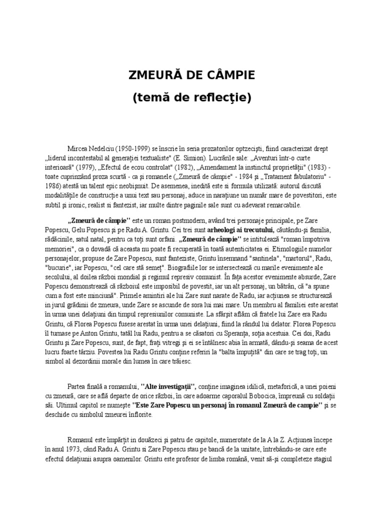 Mircea Nedelciu Wikipedia Source from : https://en.wikipedia.org/wiki/Mircea_Nedelciu Jurnalul, dosarul de documente se explica astfel si subtitlul romanului: Zmeura de câmpie poartă semnătura scriitorului mircea nedelciu, unul dintre cei mai valoroși postmoderni română și, totodată, unul dintre reprezentanții generației optzeciste. Zmeura se cultivă din două motive: Zmeura îi dă o aromă deosebită și se combină excelent cu glazura de ciocolată. Copyright romanul zmeura de campie a aparut n 1984 este mprit n patru pri i alctuit din 24 de capitole numerotate cu literele alfabetului, de la a (cuvntul arac) i pn la z (cuvntul zat).