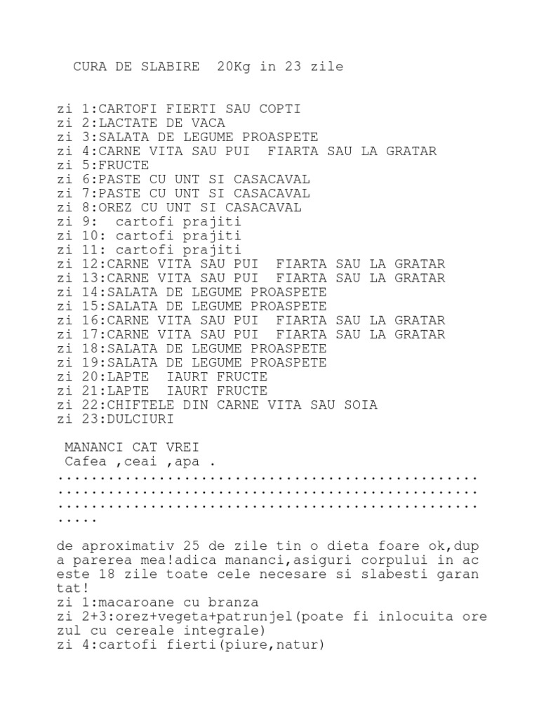 vizitati articolul complet aici : https://www.facebook.com/dietadisociata333/posts Cura de slabire 20kg in 23 zilezi 1:cartofi fierti sau coptizi 2:lactate de vacazi 3:salata de legume am ales dieta disociata pe zile, dar tinand cont in special de toate cele citite in cartile lui montignac. Este mai simplă, vă oferă motivația să continuați dieta fără să vă abateți de la drum. Dieta disociata pe 7 zile.