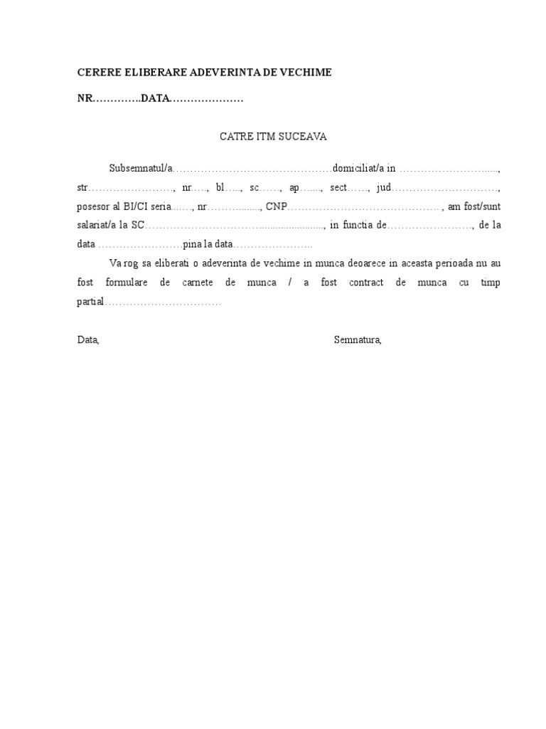 Model Cerere Adeverinta Vechime
