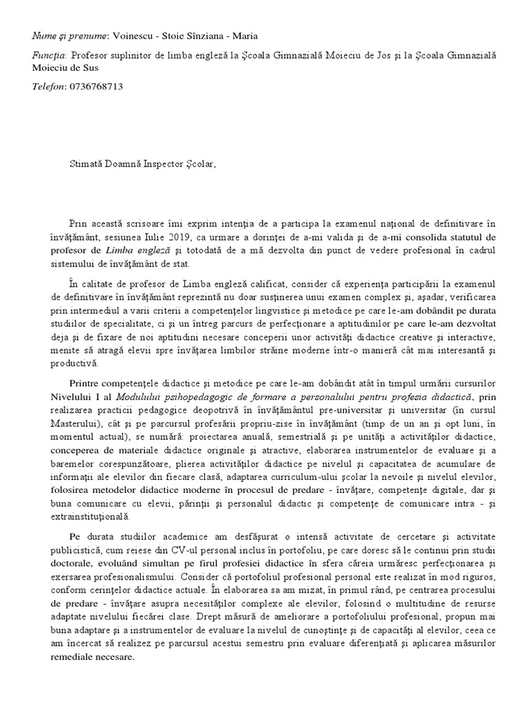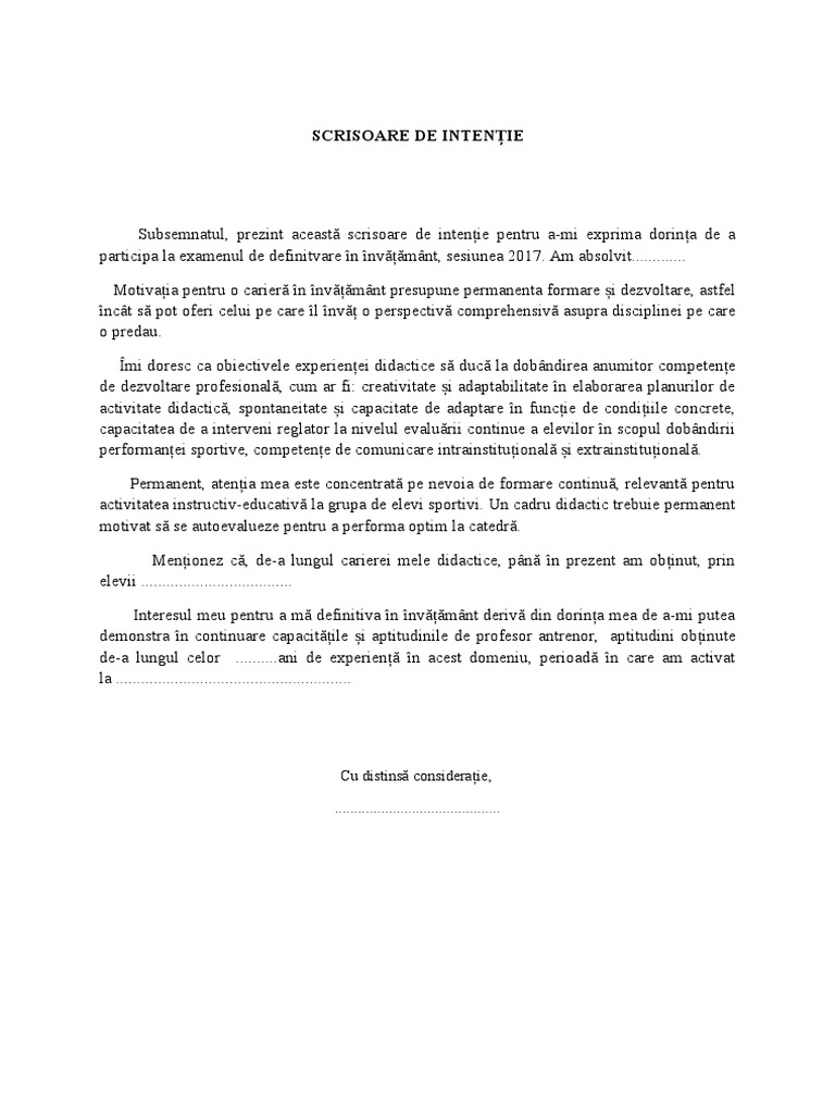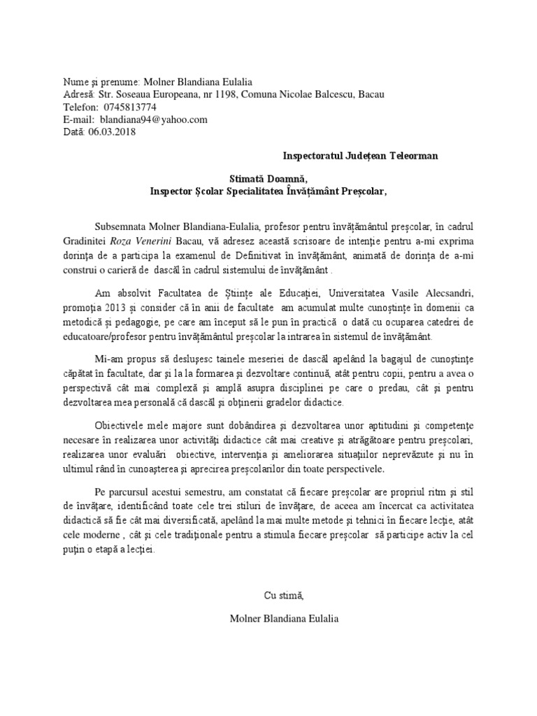 vizitati articolul complet aici : https://ro.scribd.com/document/342723679/Scrisoare-de-Intentie-Definitivat Stimate domnule/doamna, subsemnatul, prenume nume, am luat la cunostinta cu interes de posibilitatile pe care le ofera compania dumneavoastra. Aici puteti vedea un model de scrisoare de intentie pentru portofoliu de definitivat. Documentul trebuie să fie adresat inspectorului școlar și să cuprindă paragrafe despre fiecare dintre.
