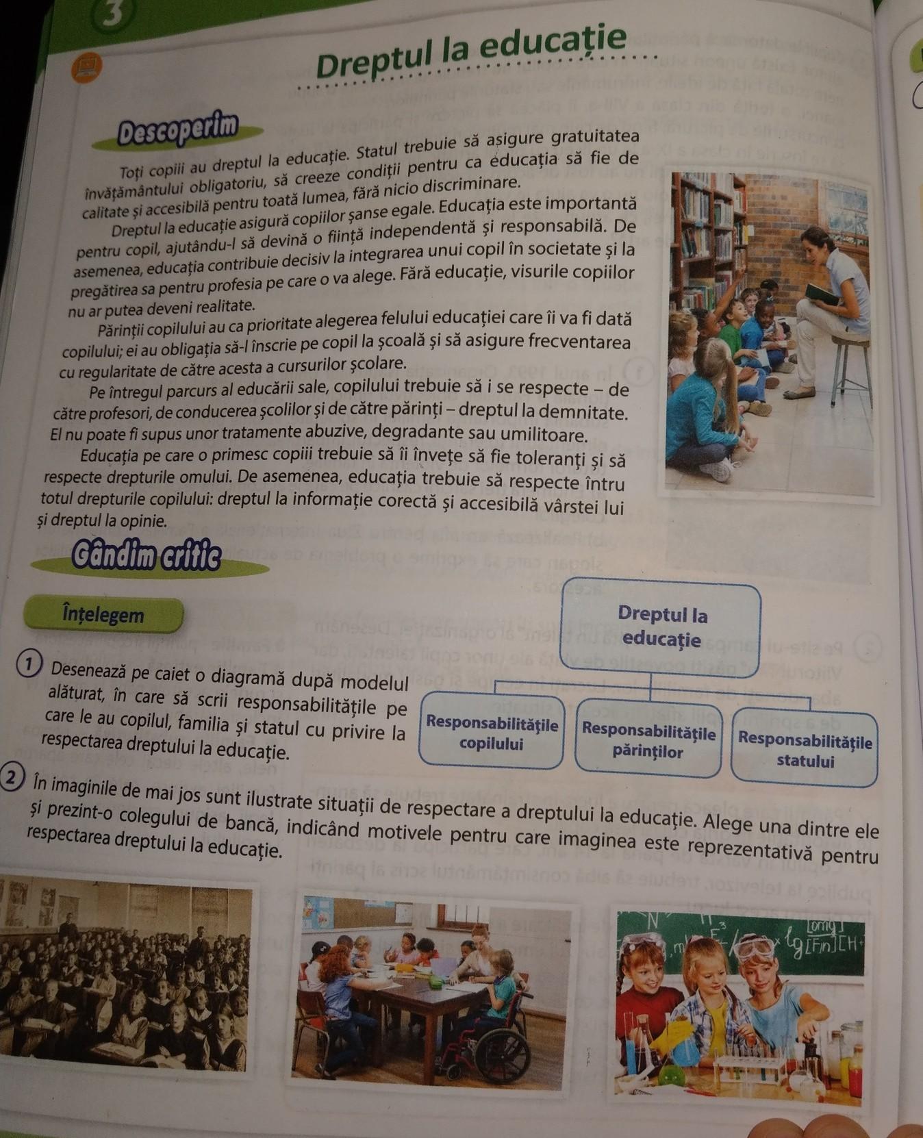 Fiecare copil are dreptul la educație. A educației şi subliniază imperativul dreptului la educaţie, drept de care toţi copiii din românia . Carta drepturilor fundamentale, articolul 14 punctul (2) (dreptul la educație). „drepturile copilului se încalcă, mai ales violența de copii este aplicată. Iniţierea copiilor în spaţiul valorilor democratice şi ale drepturilor omului constituie unul din fundamentele educaţiei, .